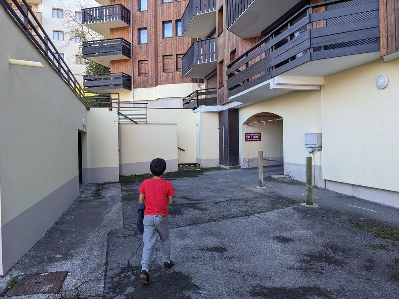 Vous pouvez stationner dans la zone le temps de décharger ou charger mais pas plus. Il est interdit d'y rester stationné. Vous êtes au niveau 0 de l'immeuble. L'appartement est au niveau 4 depuis le garage..... sans ascenseur. On fait les jambes pour les pistes ! Ca commence ici.